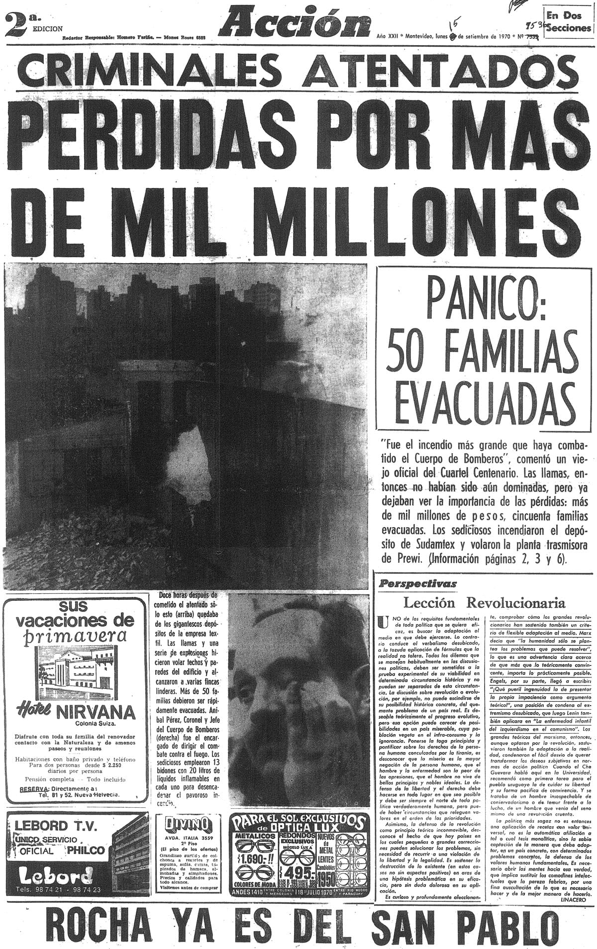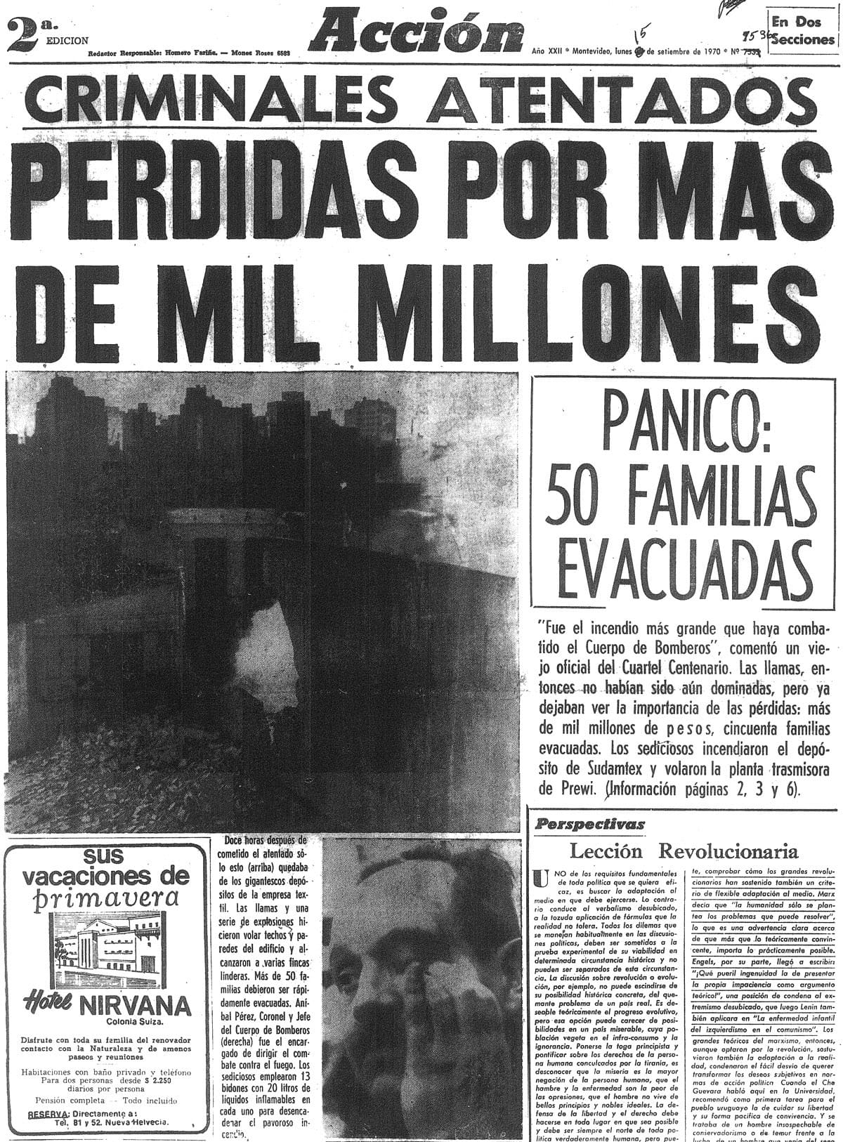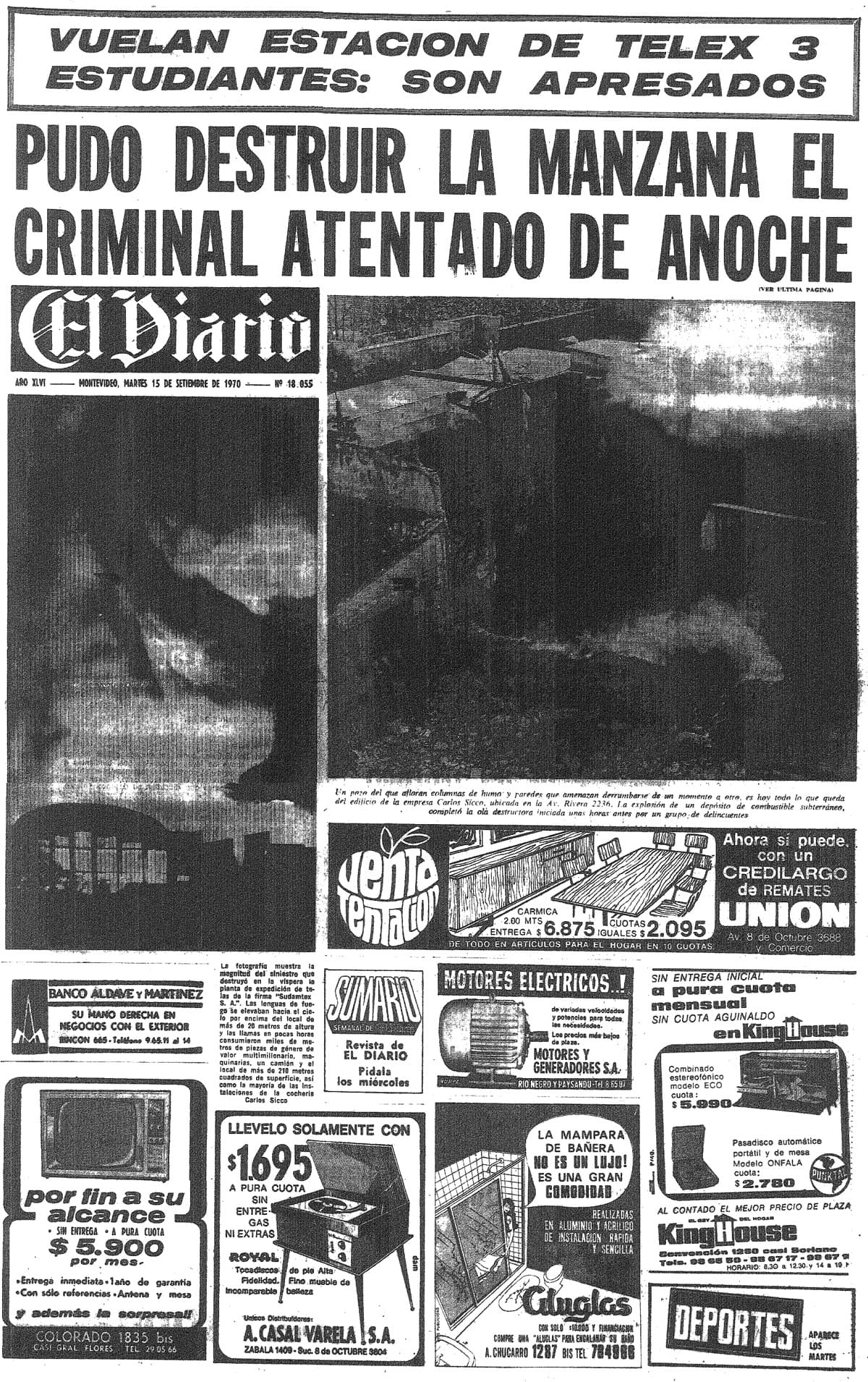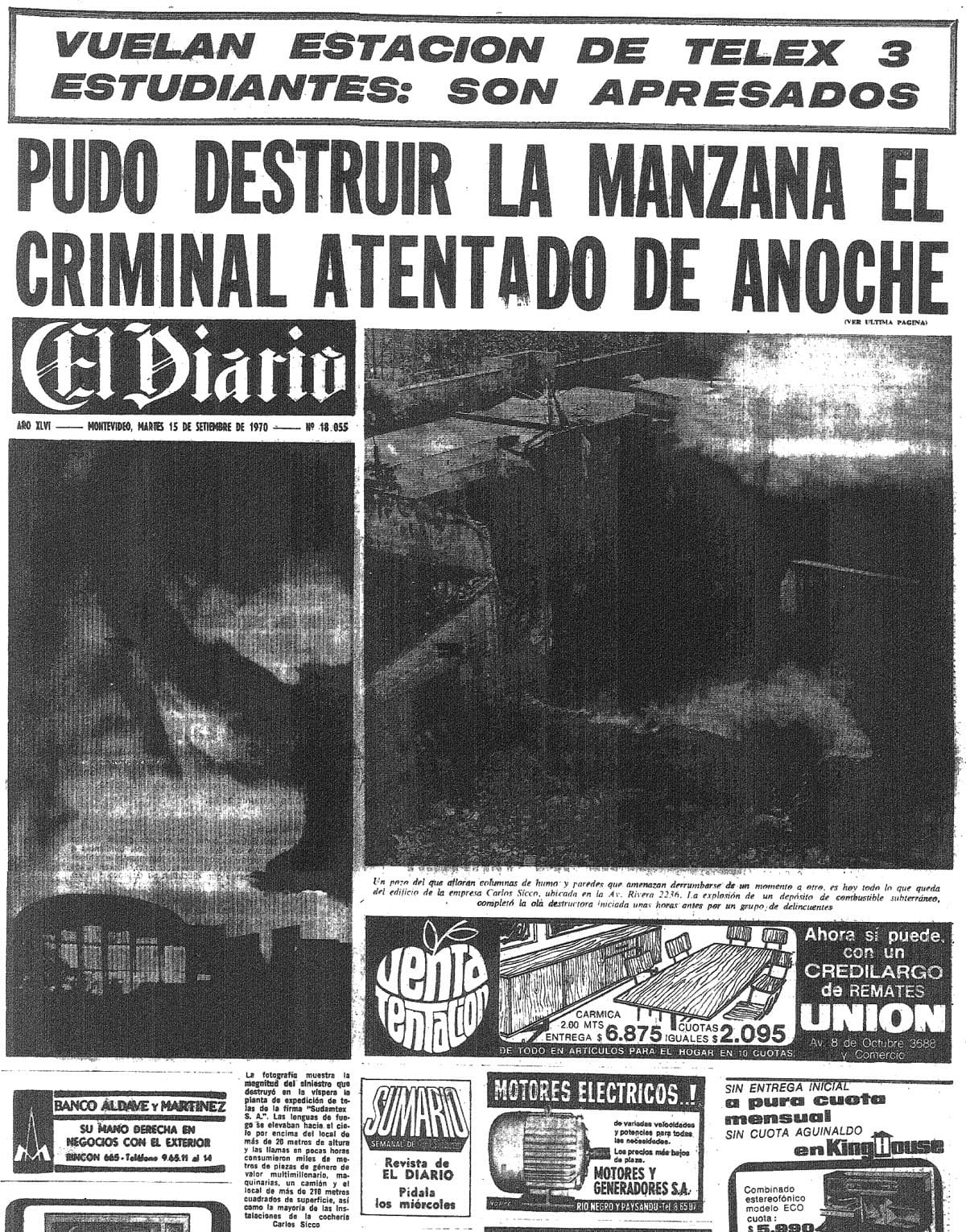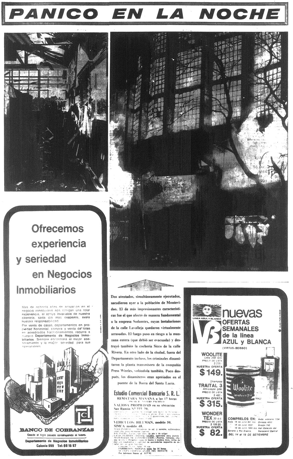 Dos atentados, simultáneamente ejecutados, sacudieron ayer a la población de Montevideo. El de más impresionantes características fue el que afectó de manera fundamental a la empresa Sudamtex cuyas instalaciones de la calle Lavalleja quedaron virtualmente arrasadas. El fuego puso en riesgo a la manzana entera... y destruyó también la cochería Sicco de la calle Rivera... En otro lado de la ciudad,... los criminales dinamitaron la planta transmisora de la compañía Press Wireless... Aparecen fotos.