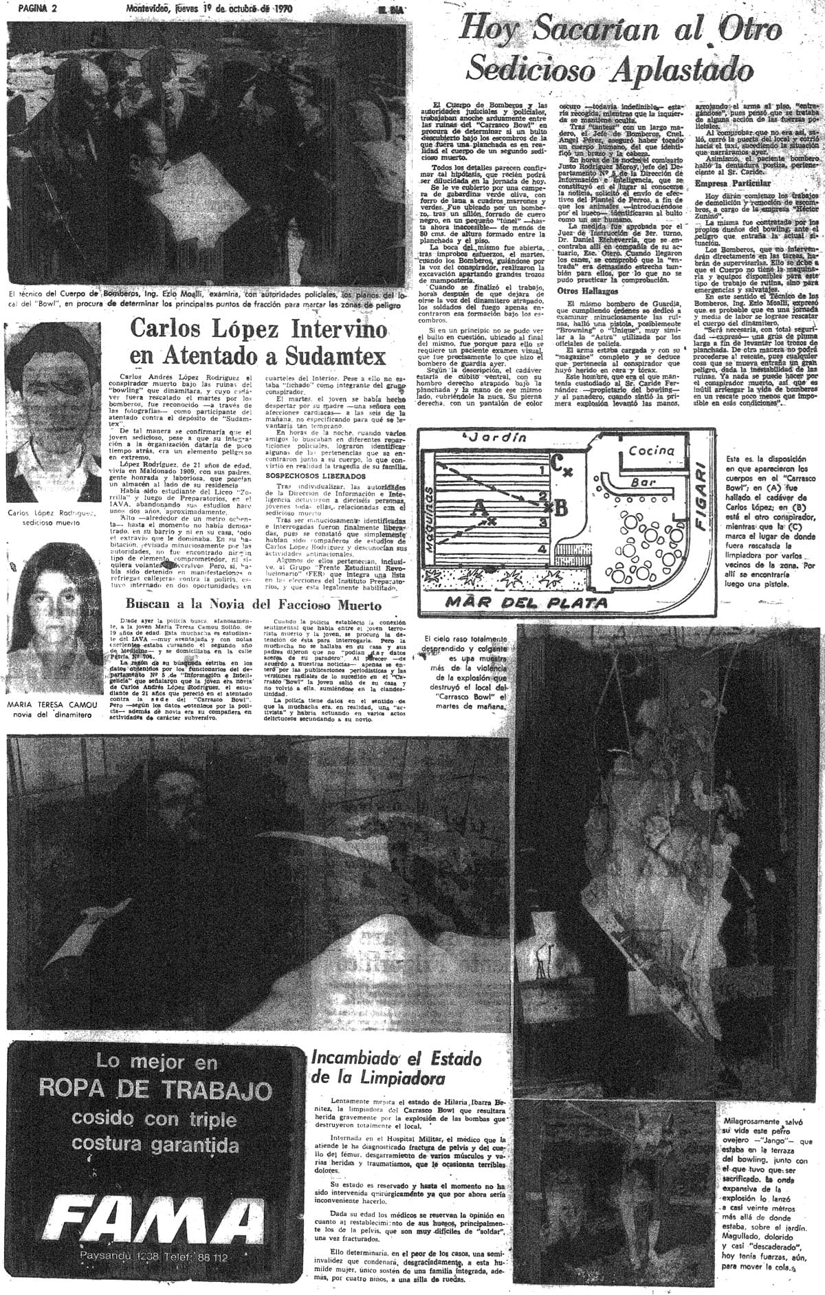 ...el conspirador muerto bajo las ruinas del “bowling” que dinamitara y cuyo cadáver fuera rescatado el martes por los bomberos, fue reconocido... como participante del atentado contra el depósito de “Sudamtex”... Aparecen fotos.