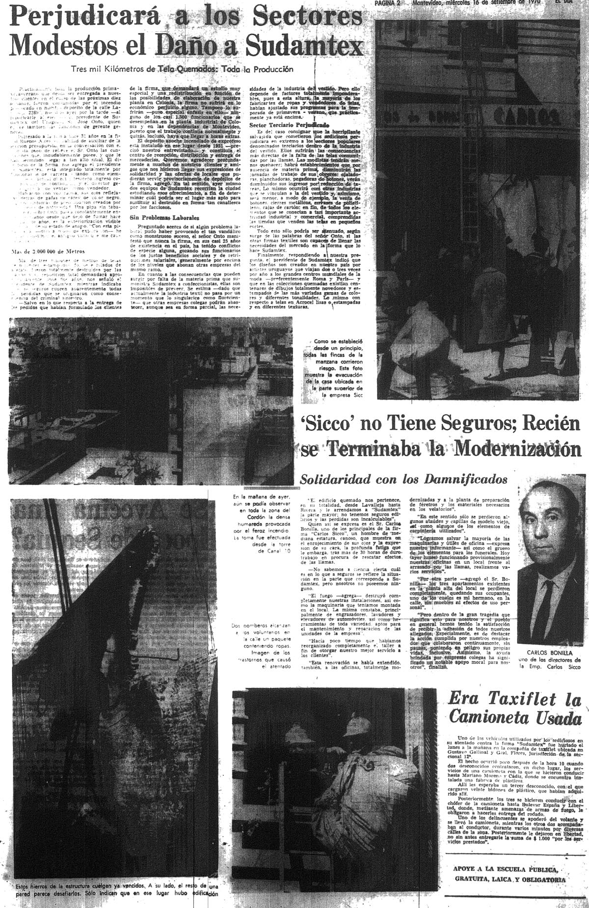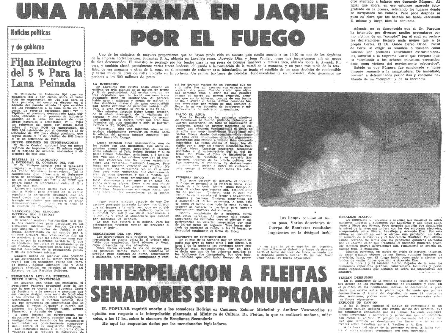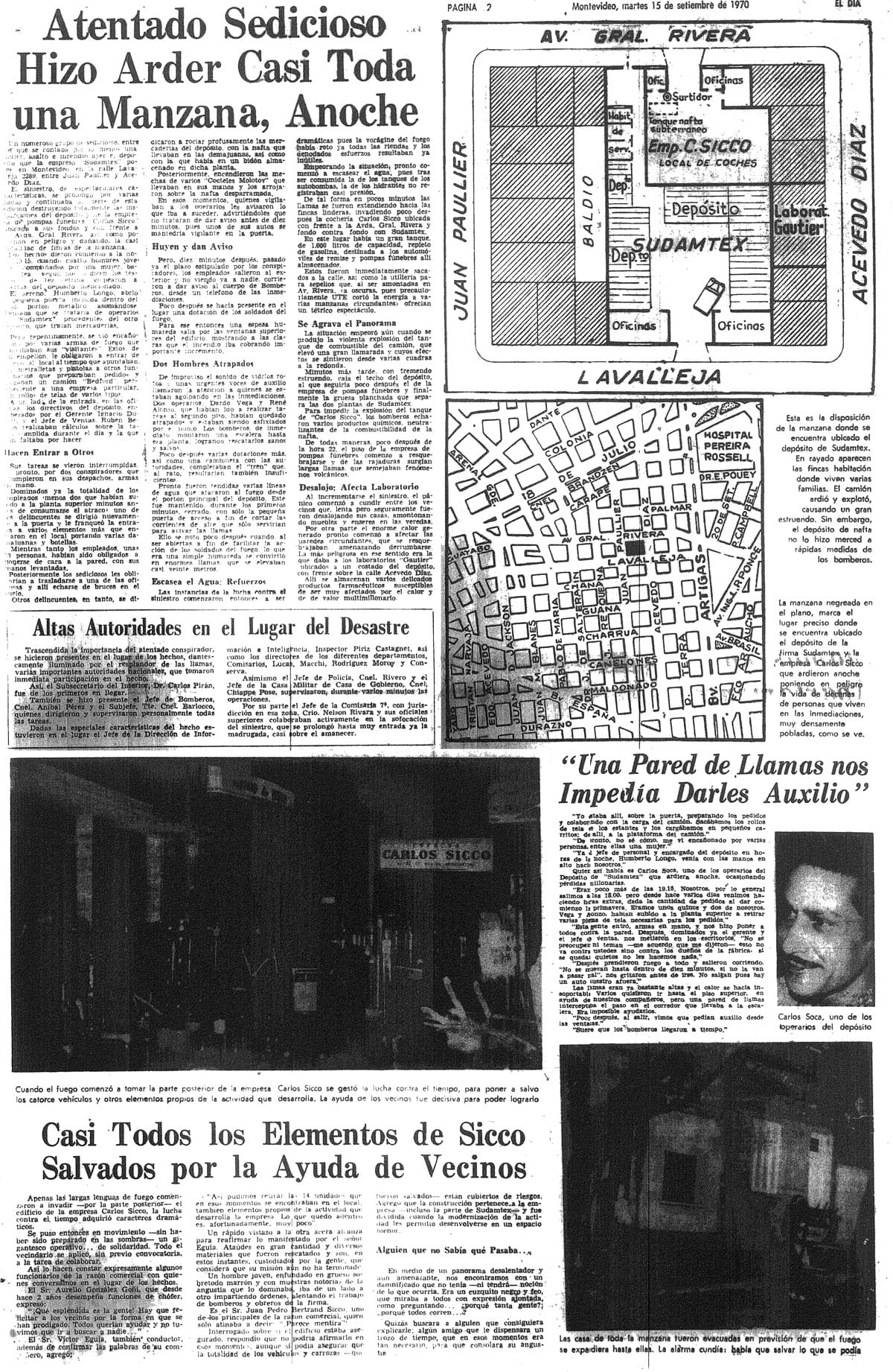 Un numeroso grupo de sediciosos entre los que se contaba por lo menos una mujer, asaltó e incendió ayer el depósito que la empresa “Sudamtex” posee en Montevideo,... El siniestro, de espectaculares características,... en pocos minutos las llamas fueron extendiéndose hacia las fincas linderas,... invadiendo poco después la cochería Carlos Sicco... Aparecen fotos y croquis.