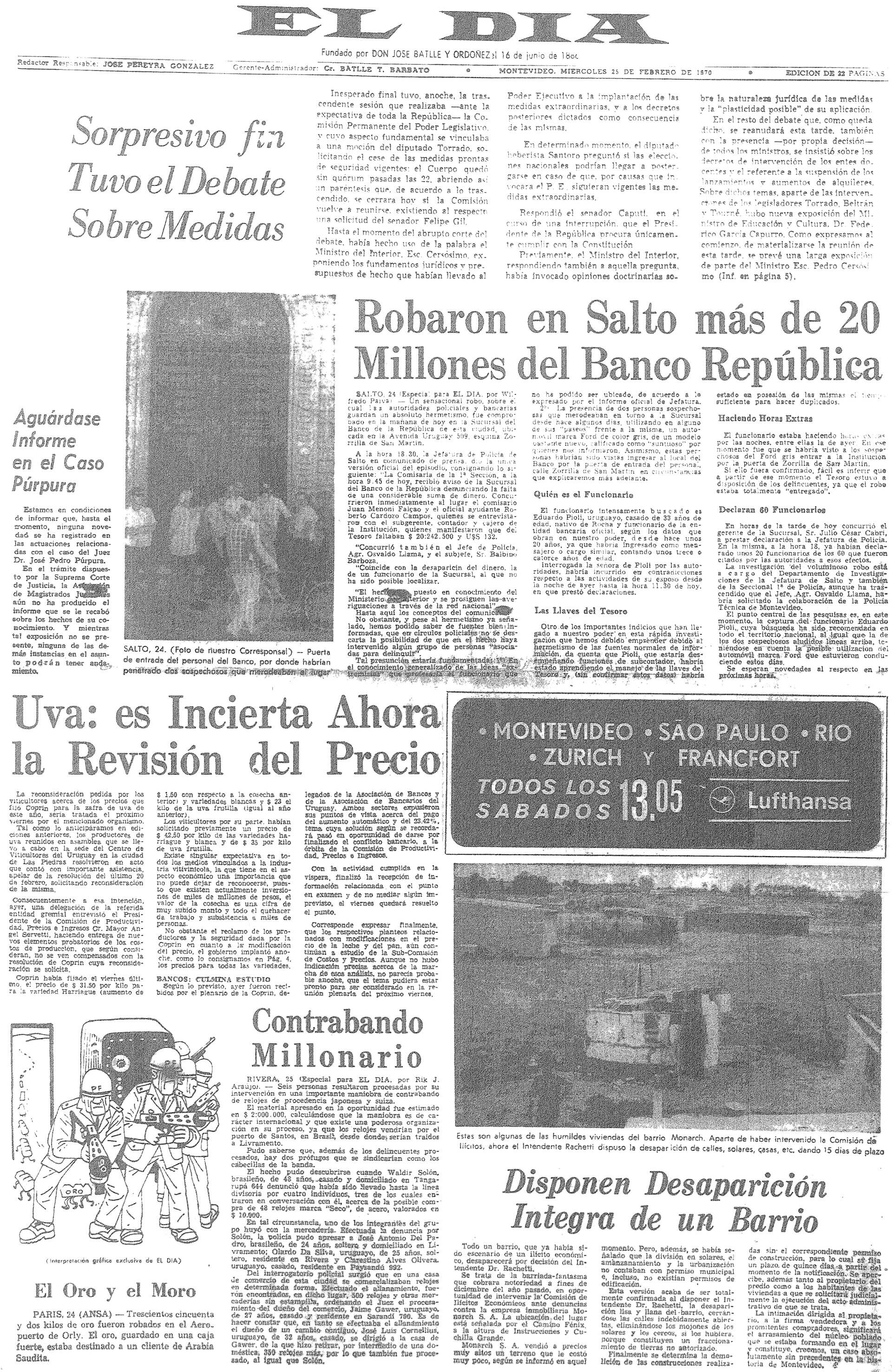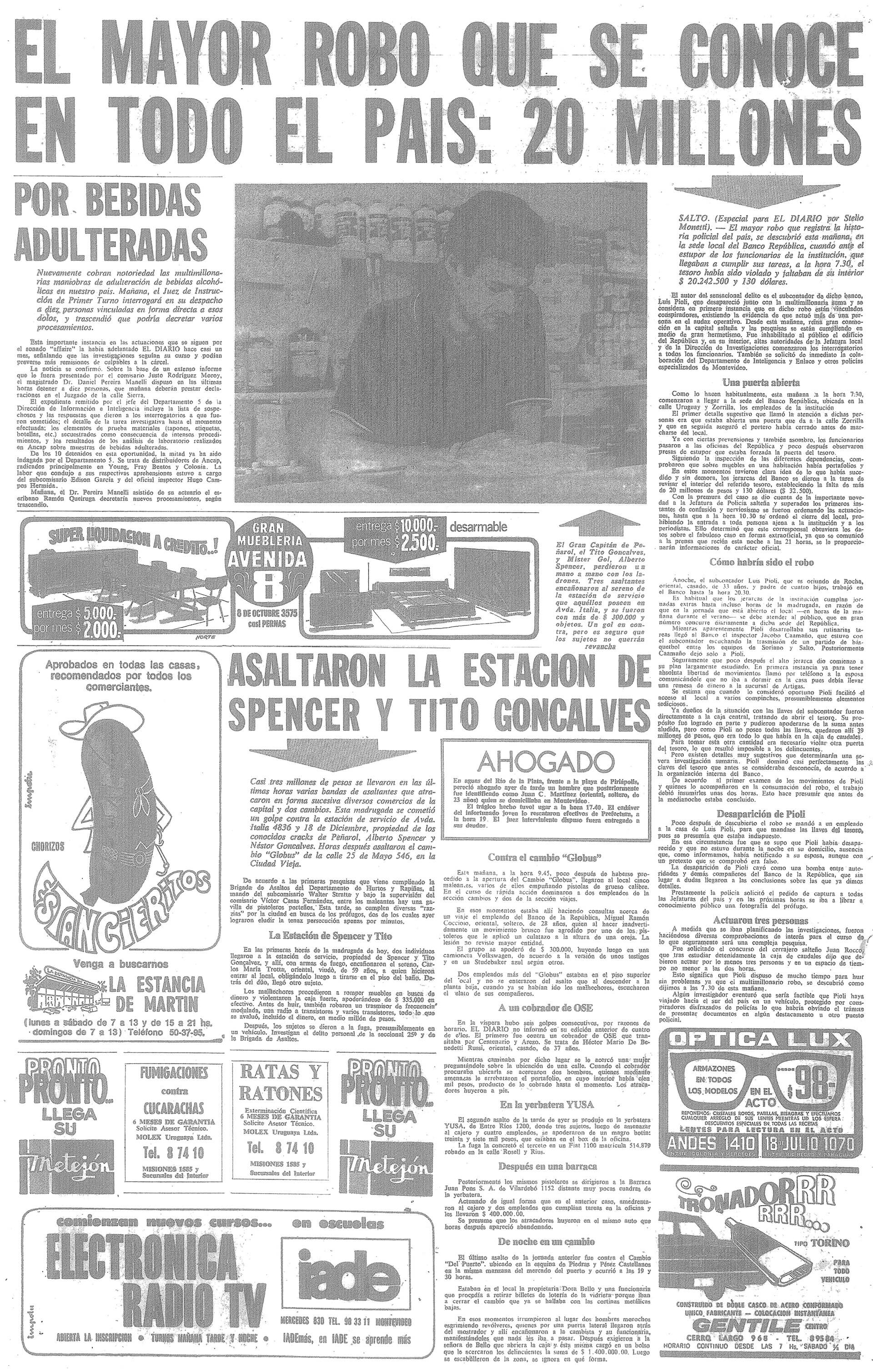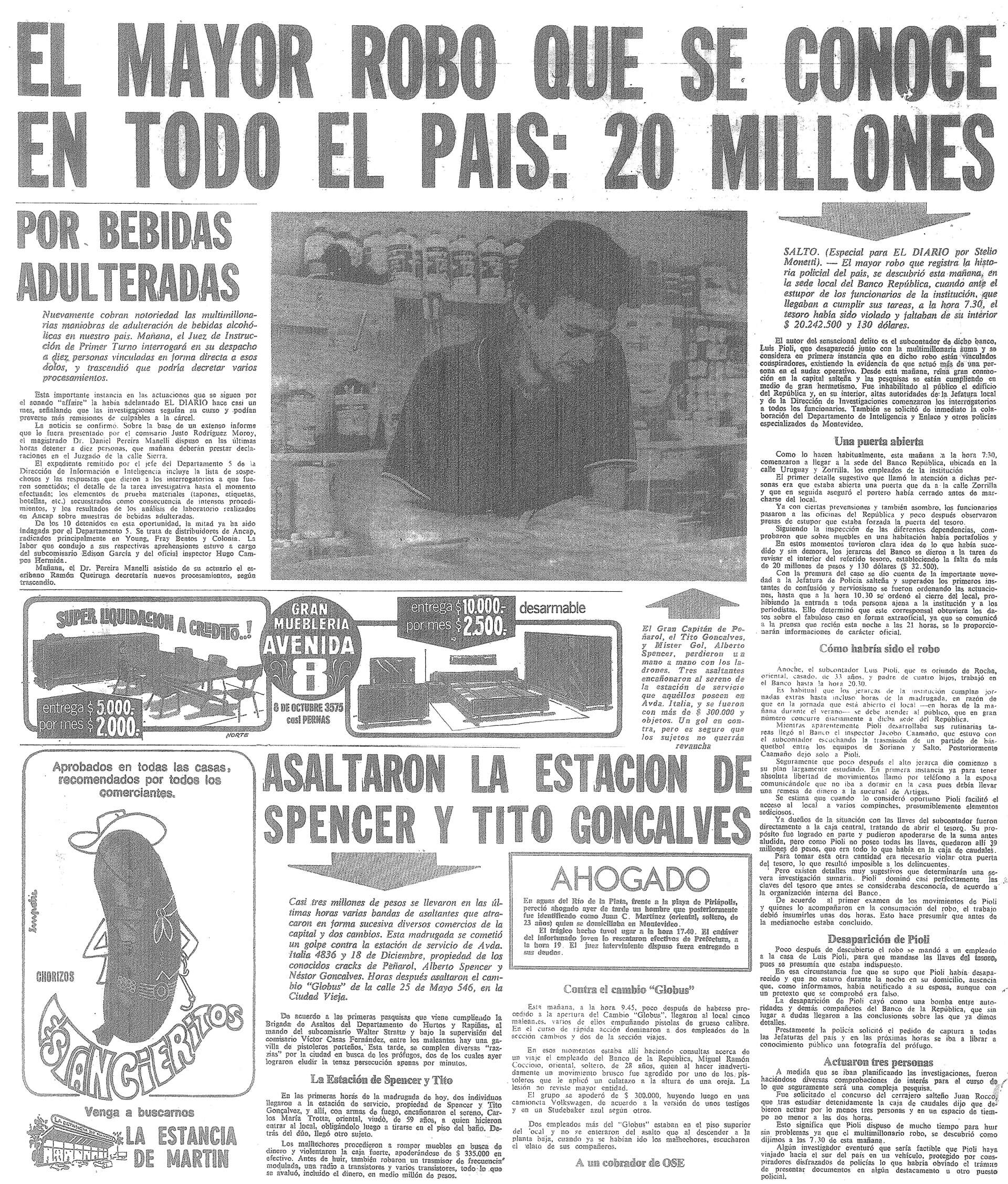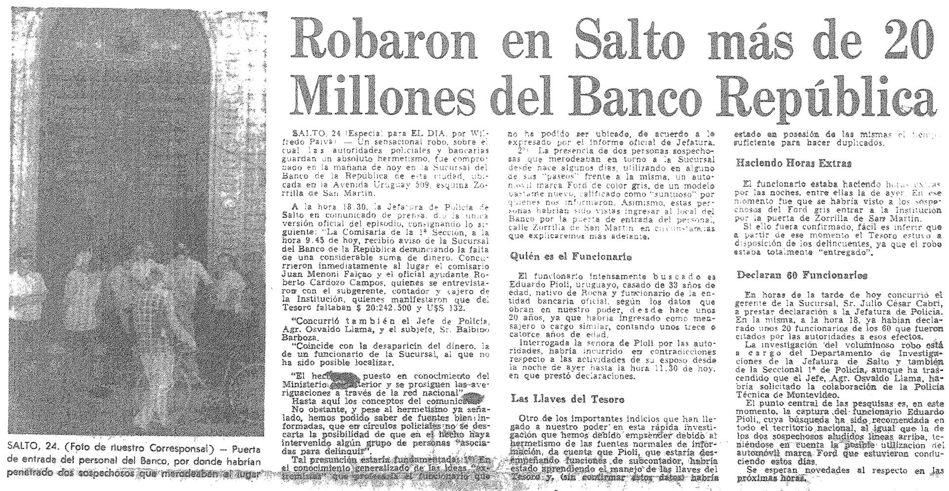 Salto, 24- Un sensacional robo,... fue comprobado en la mañana de hoy en la Sucursal del Banco de la República en esta ciudad... se entrevistaron con el subgerente contador y cajero de la Institución, quienes manifestaron que del Tesoro faltaban $ 20.242.500 y U$S 132... Coincide con la desaparición del dinero, la de un funcionario de la Sucursal, al que no ha sido posible localizar.