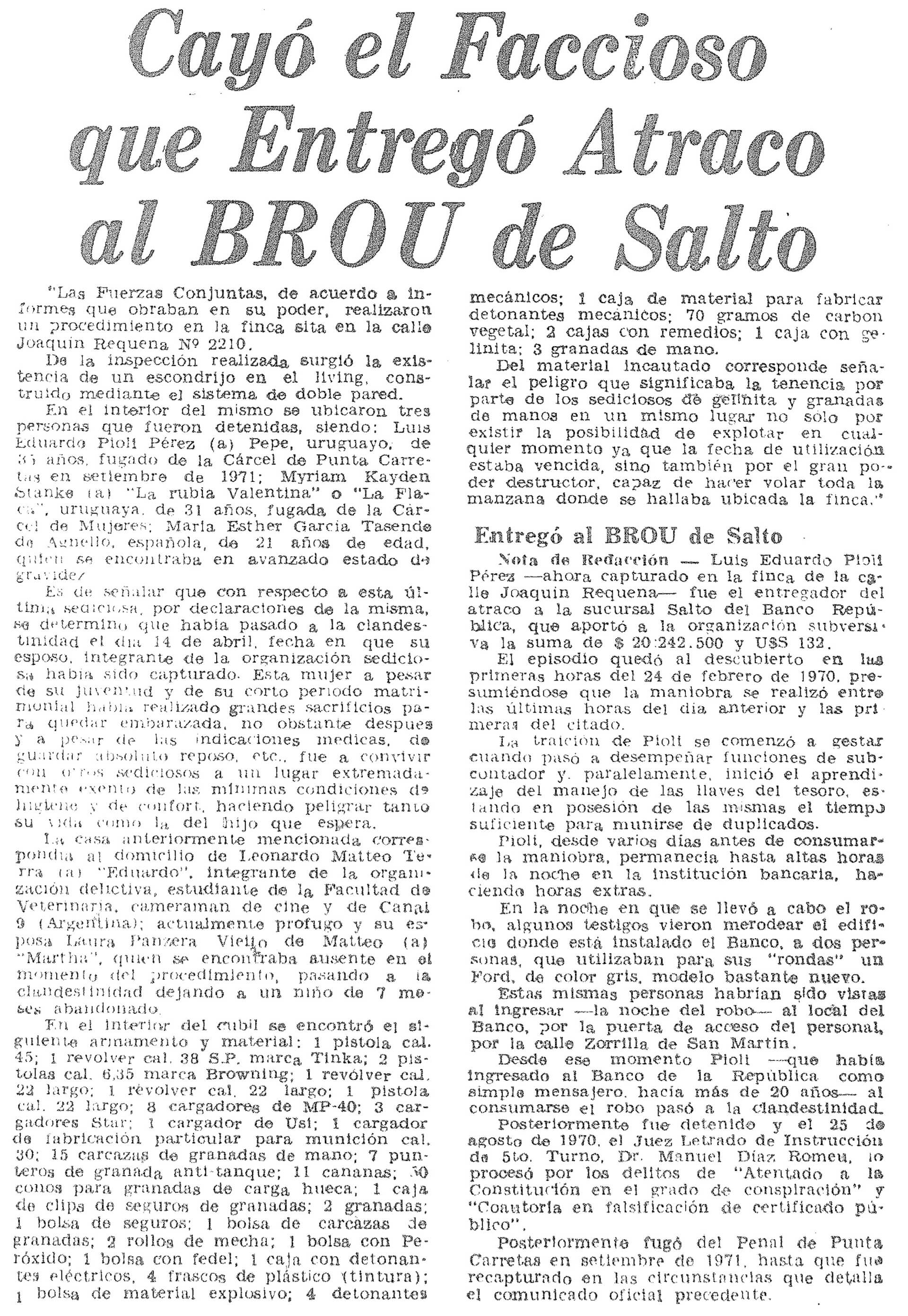 TÍTULO: “Cayó el Faccioso que Entregó Asalto al BROU de Salto”