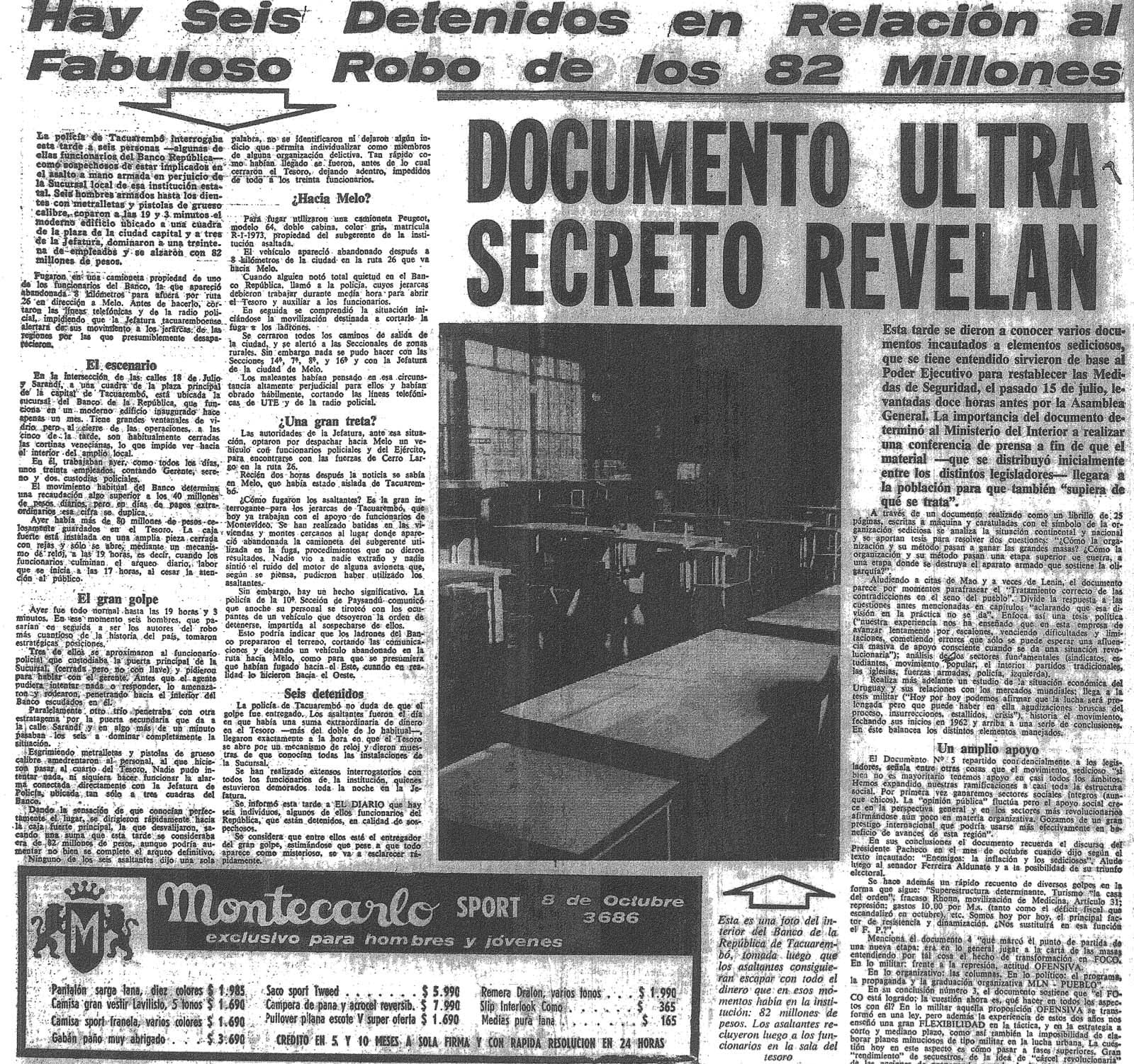 ... Seis hombres armados hasta los dientes con metralletas y pistolas de grueso calibre, coparon... el moderno edificio... dominaron a una treintena de empleados y se alzaron con 82 millones de pesos. Fugaron en una camioneta propiedad de uno de los funcionarios del Banco... Aparece foto.