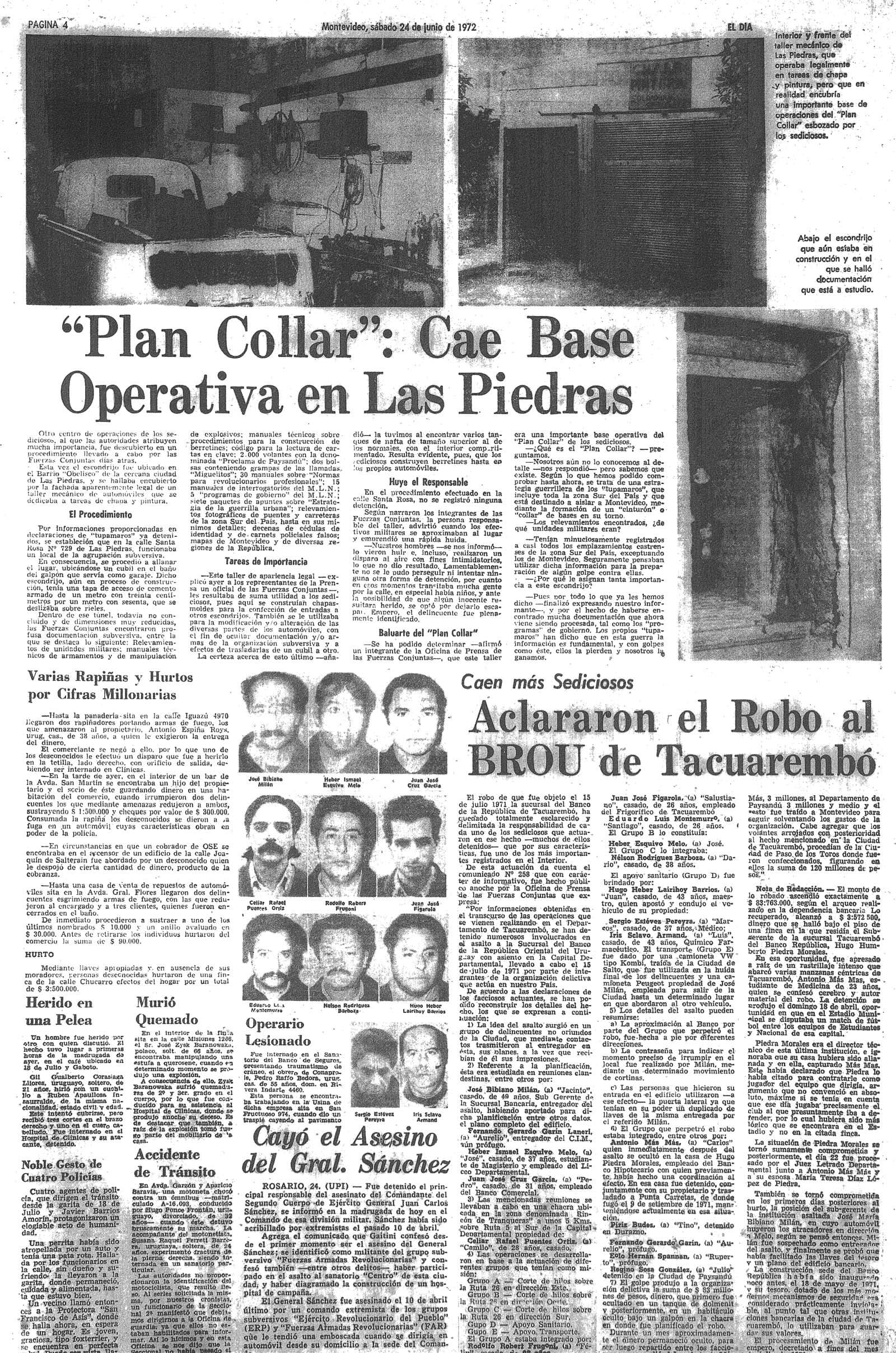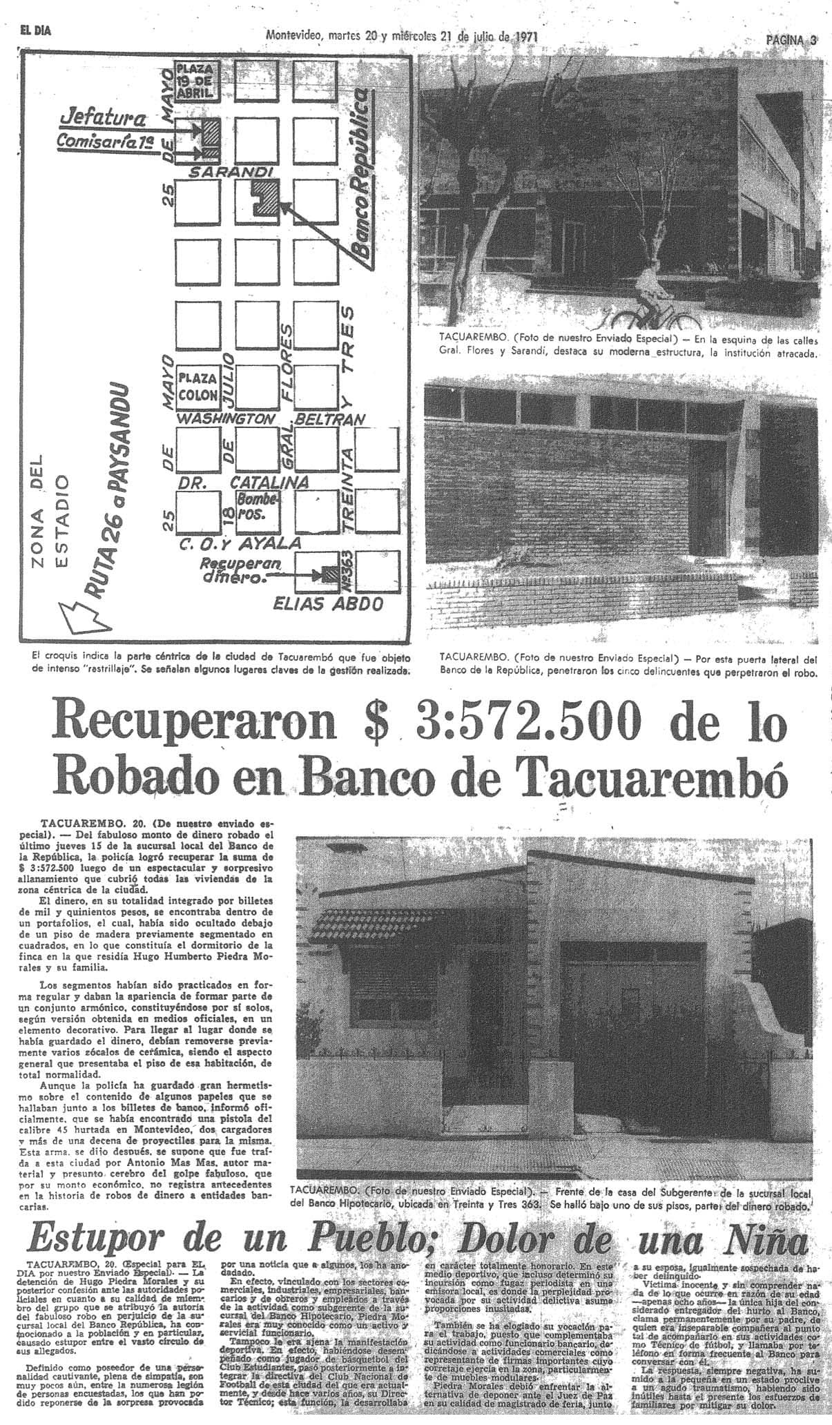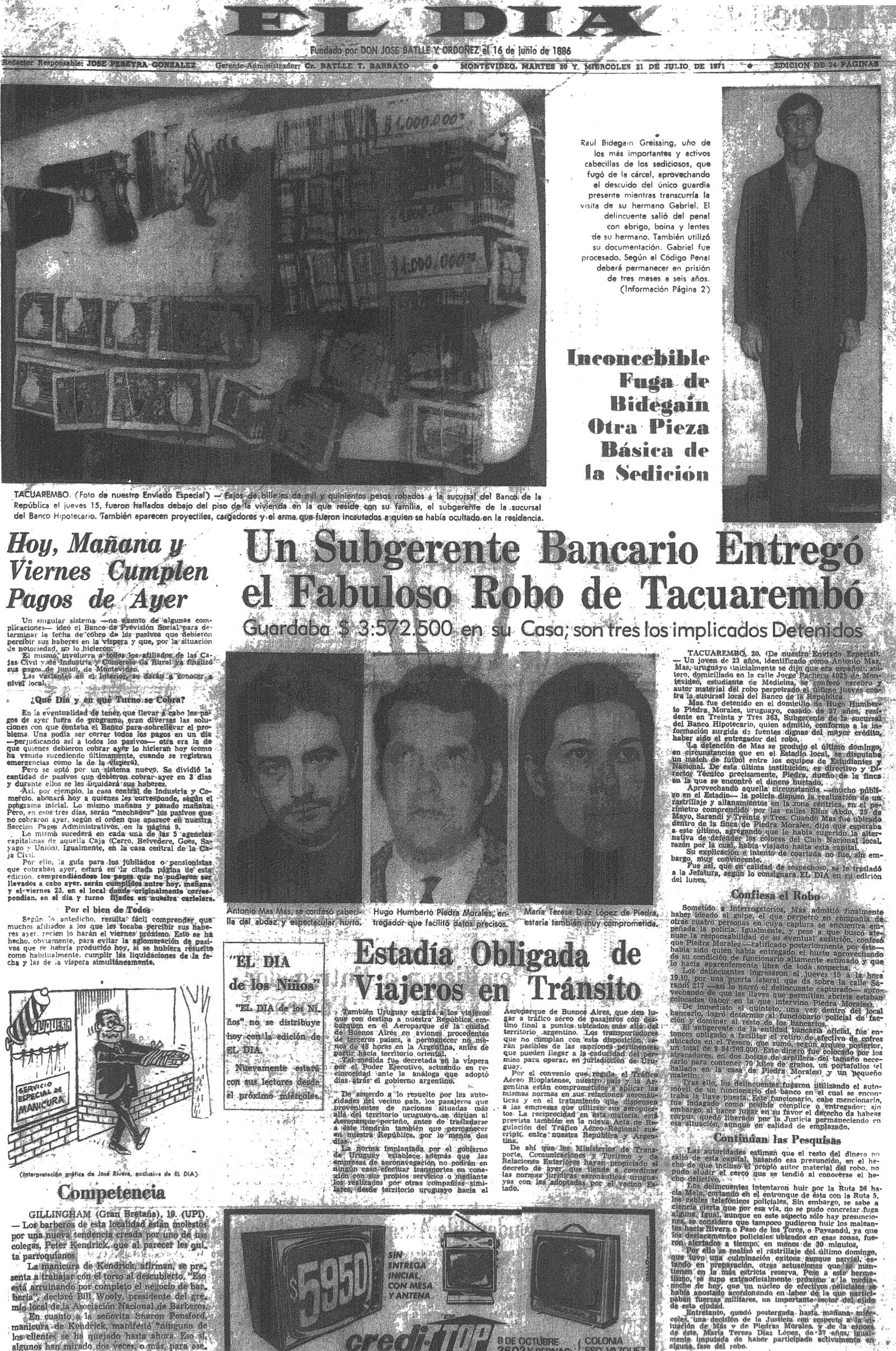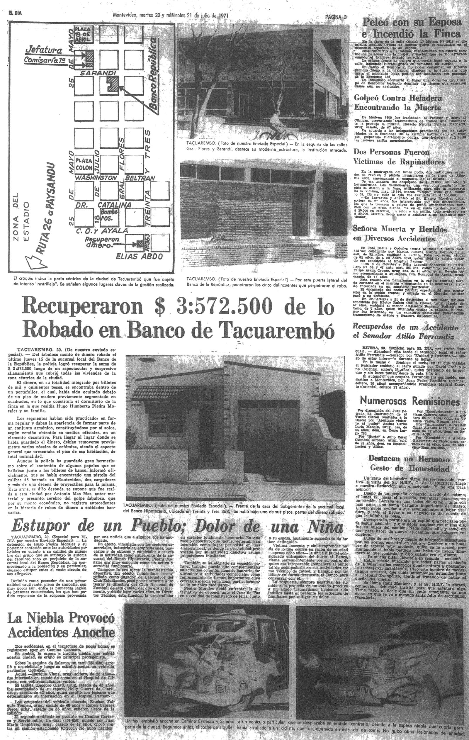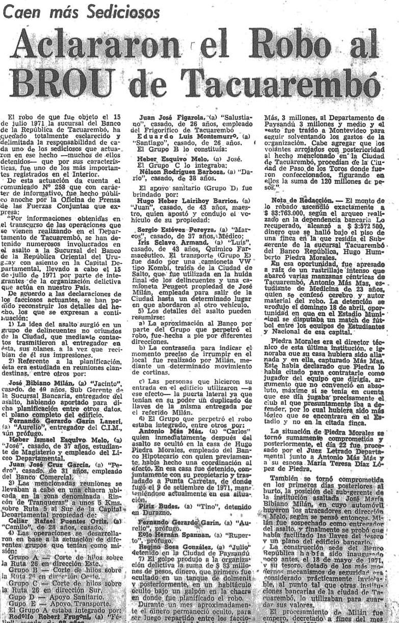 Caen más sediciosos. El robo del que fue objeto el 15 de julio de 1971 la sucursal del Banco República de Tacuarembó ha quedado totalmente esclarecido... Aparecen fotos.