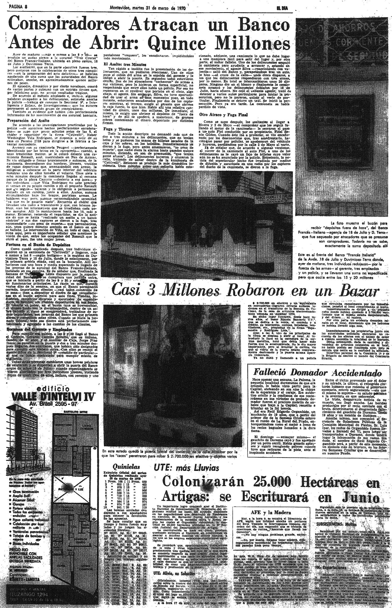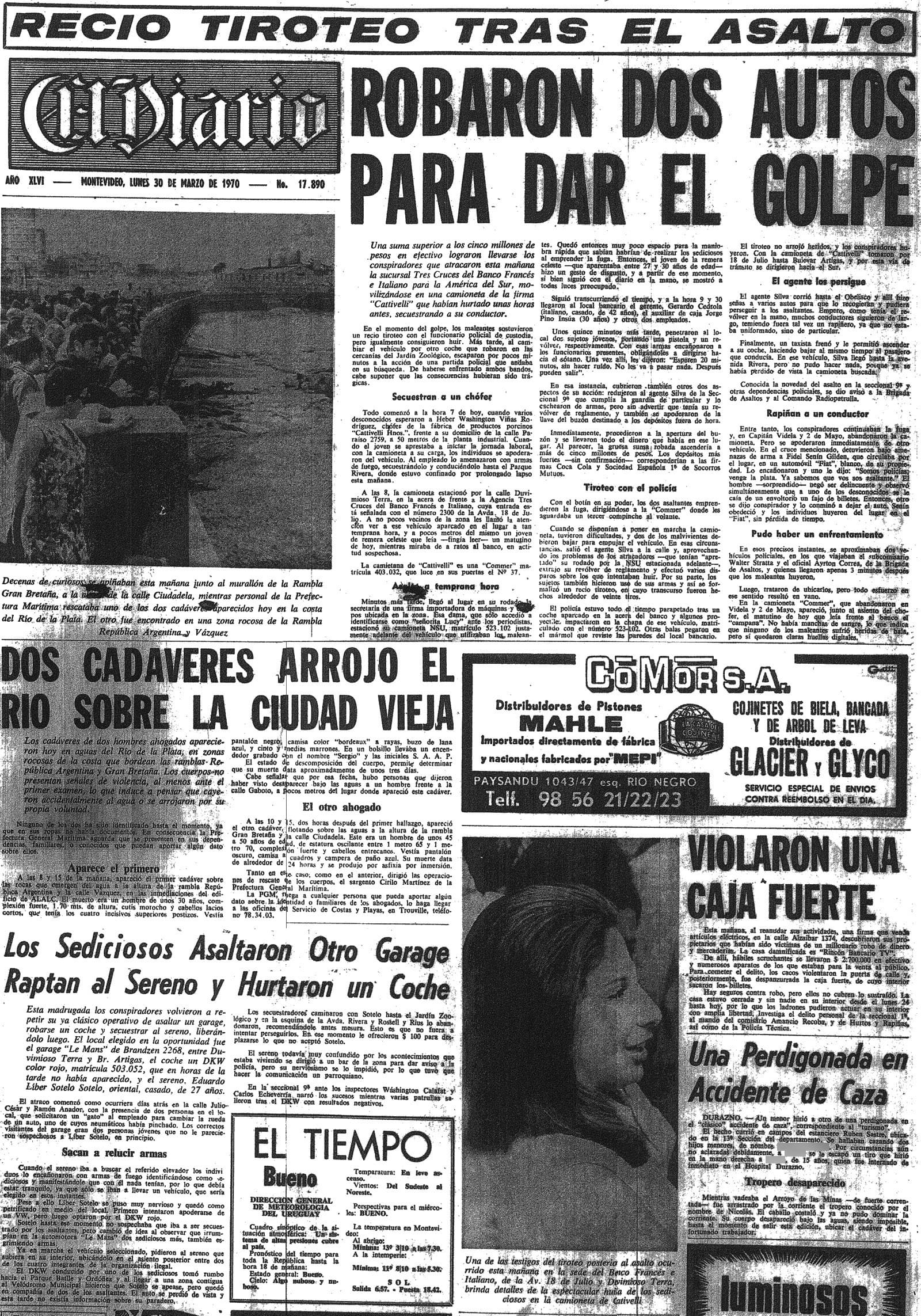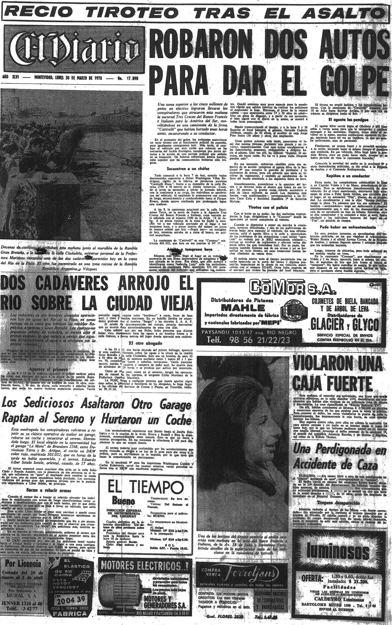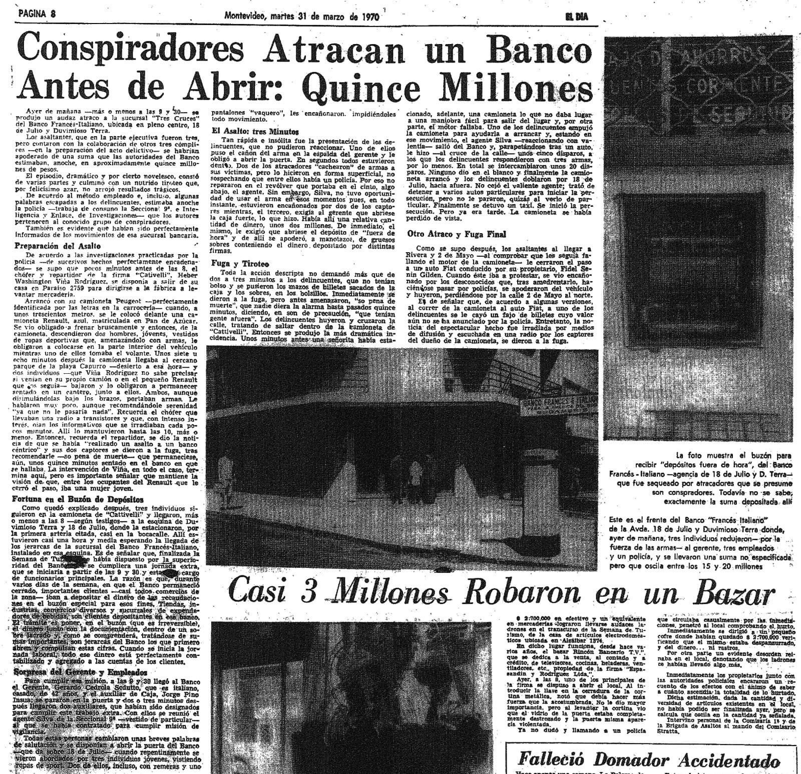 Ayer de mañana-más o menos a las 9 y 30-a la sucursal “Tres Cruces” del Banco Francés-Italiano, ubicada en... 18 de Julio y Duvimioso Terra… se pusieron los mazos... en los bolsillos... huyeron y cruzaron la calle... una señorita había estacionado, adelante, una camioneta... el motor fallaba. Uno de los delincuentes empujó la camioneta... el agente Silva-salió del banco...-le hizo unos cinco disparos… los delincuentes respondieron con tres armas... la camioneta arrancó… Aparecen fotos de...