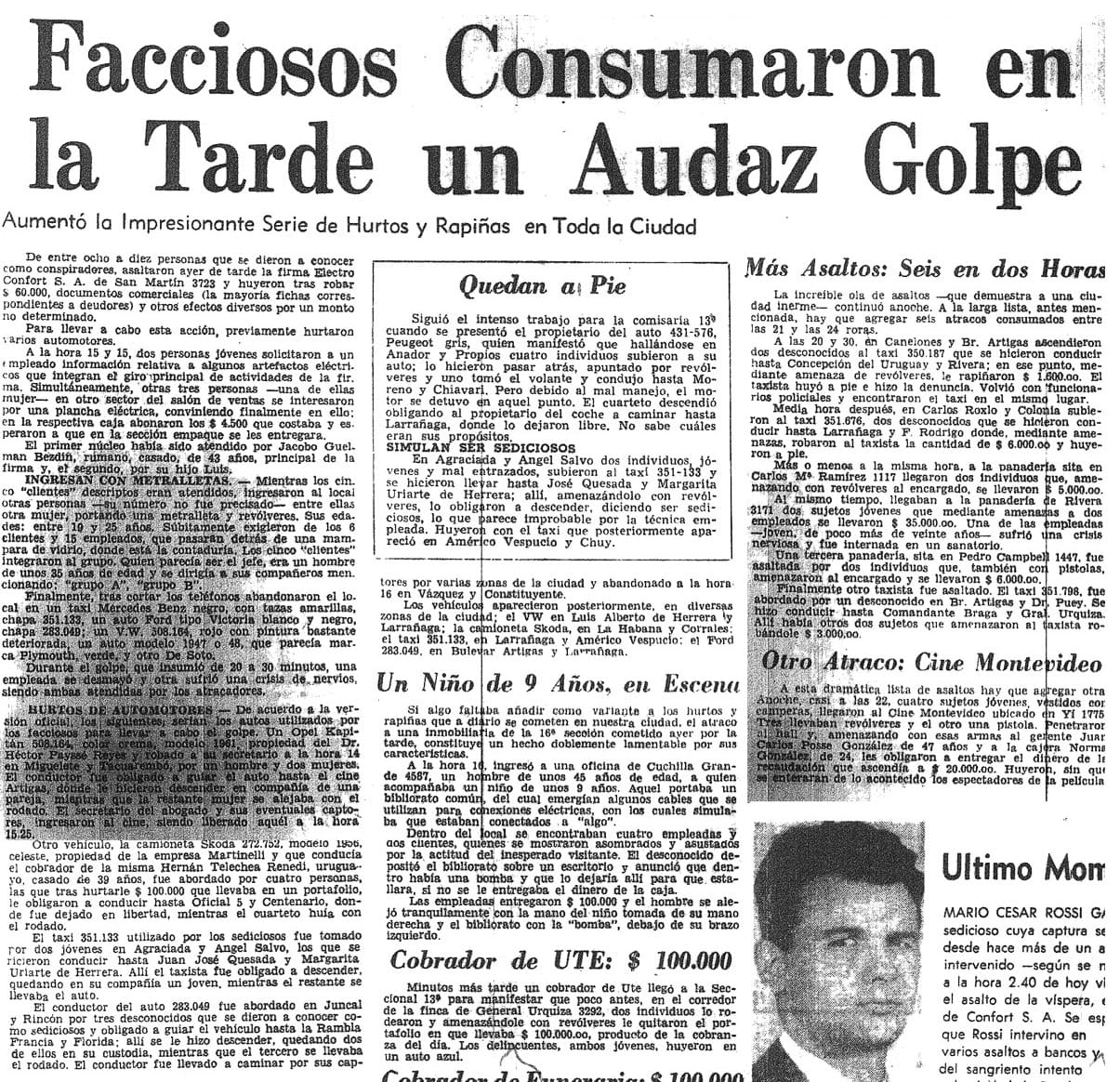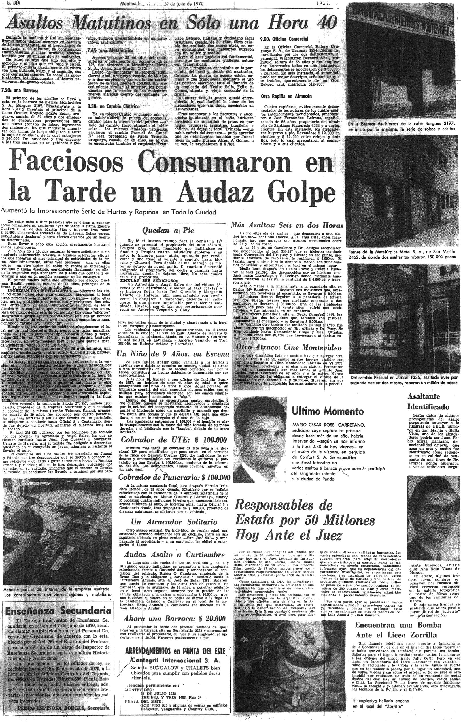 Aumentó la impresionante serie de hurtos y rapiñas en toda la ciudad. De entre ocho y diez personas que se dieron a conocer como conspiradores, asaltaron ayer de tarde la firma Electro Confort S.A. de San Martín 3723 y huyeron tras robar $ 60.000, documentos comerciales... y otros efectos diversos...