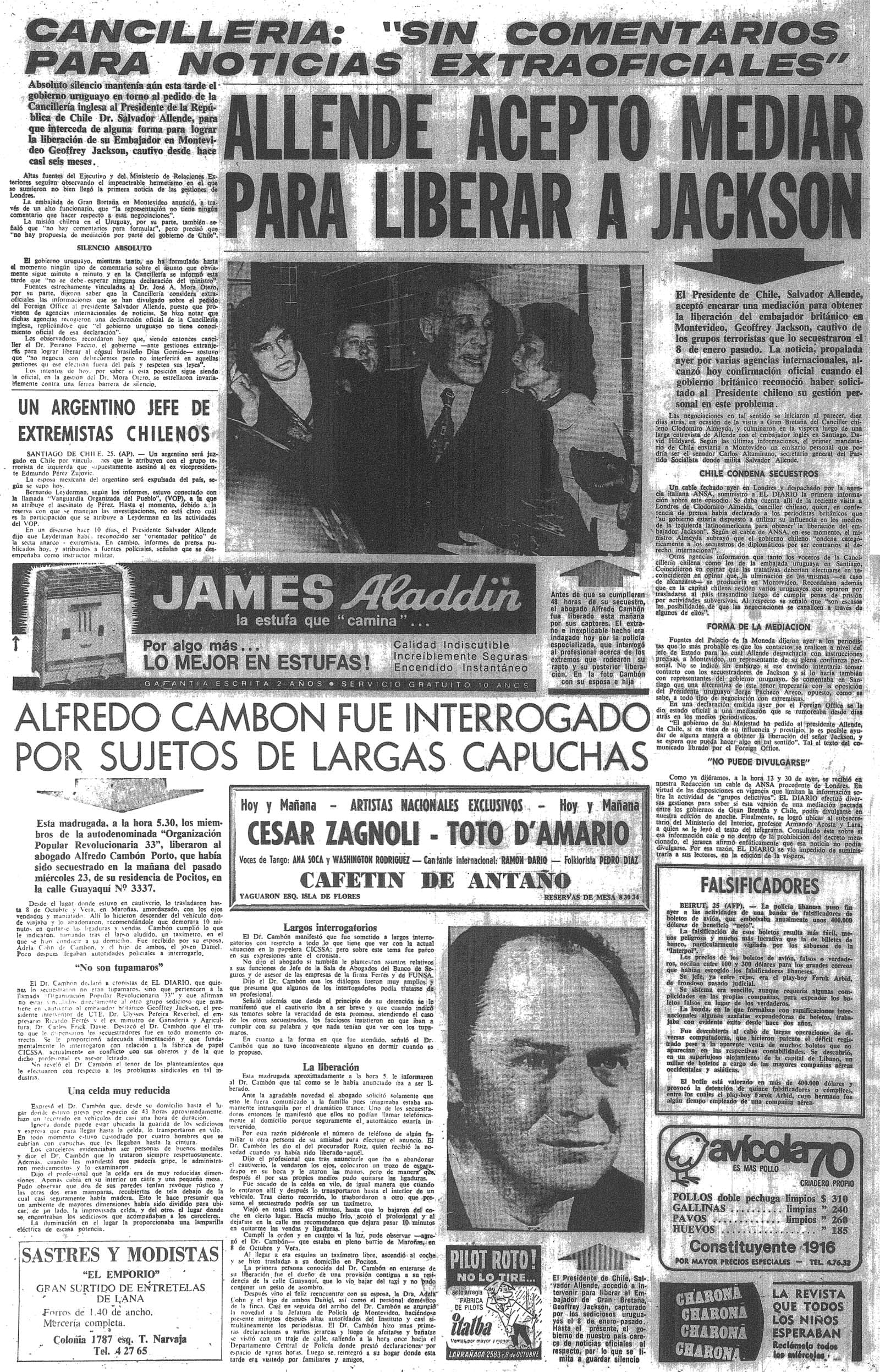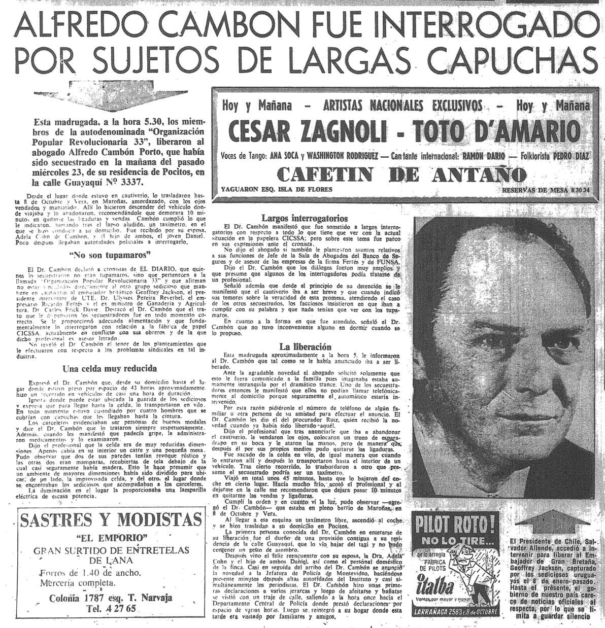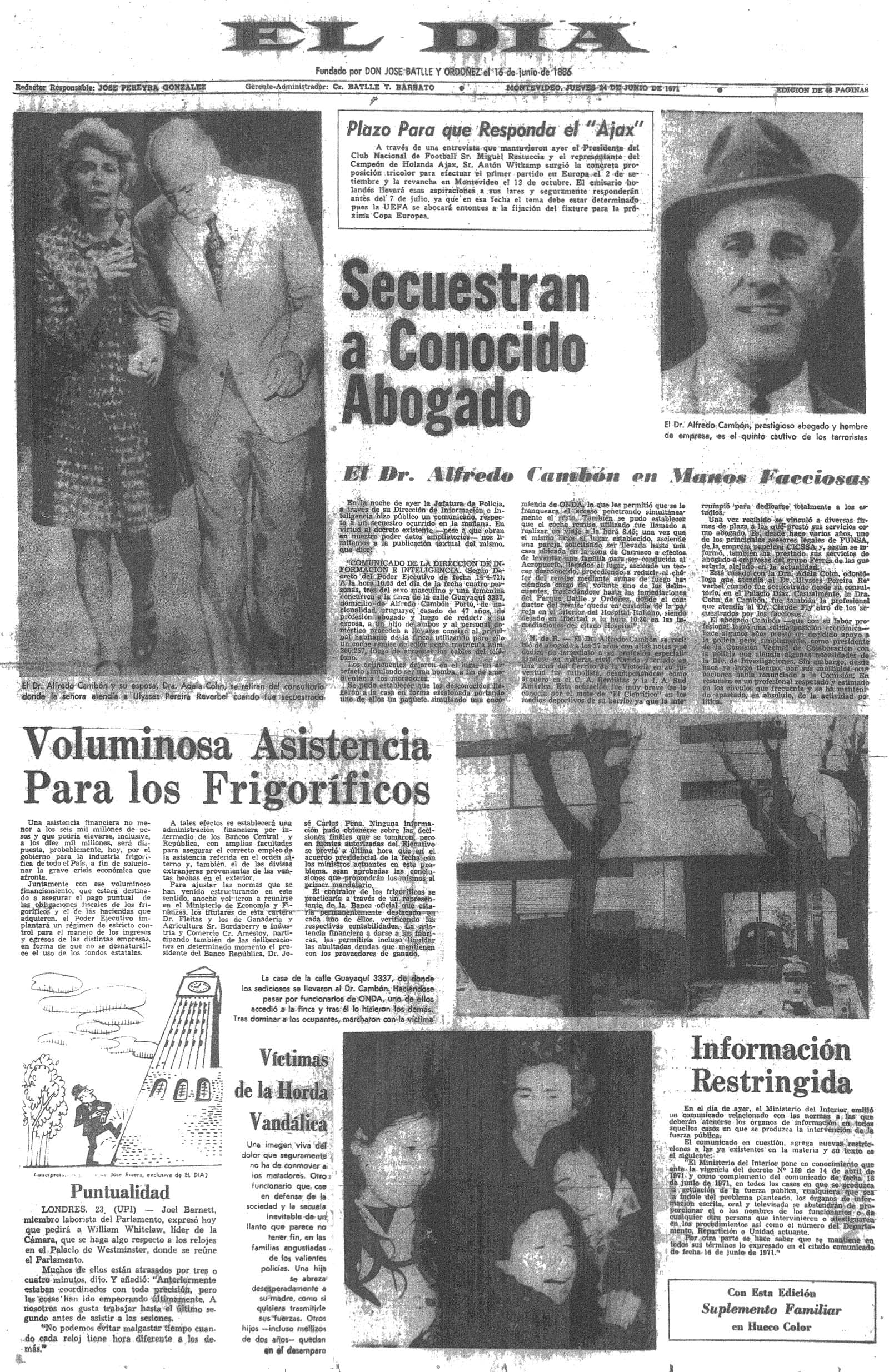 El Dr. Alfredo Cambón en manos facciosas... cuatro personas, tres del sexo masculino y una femenina concurren a la finca de la calle Guayaquí 3337, domicilio de Alfredo Cambón Porto,... proceden a llevarse consigo al principal habitante de la finca...Aparecen fotos.
