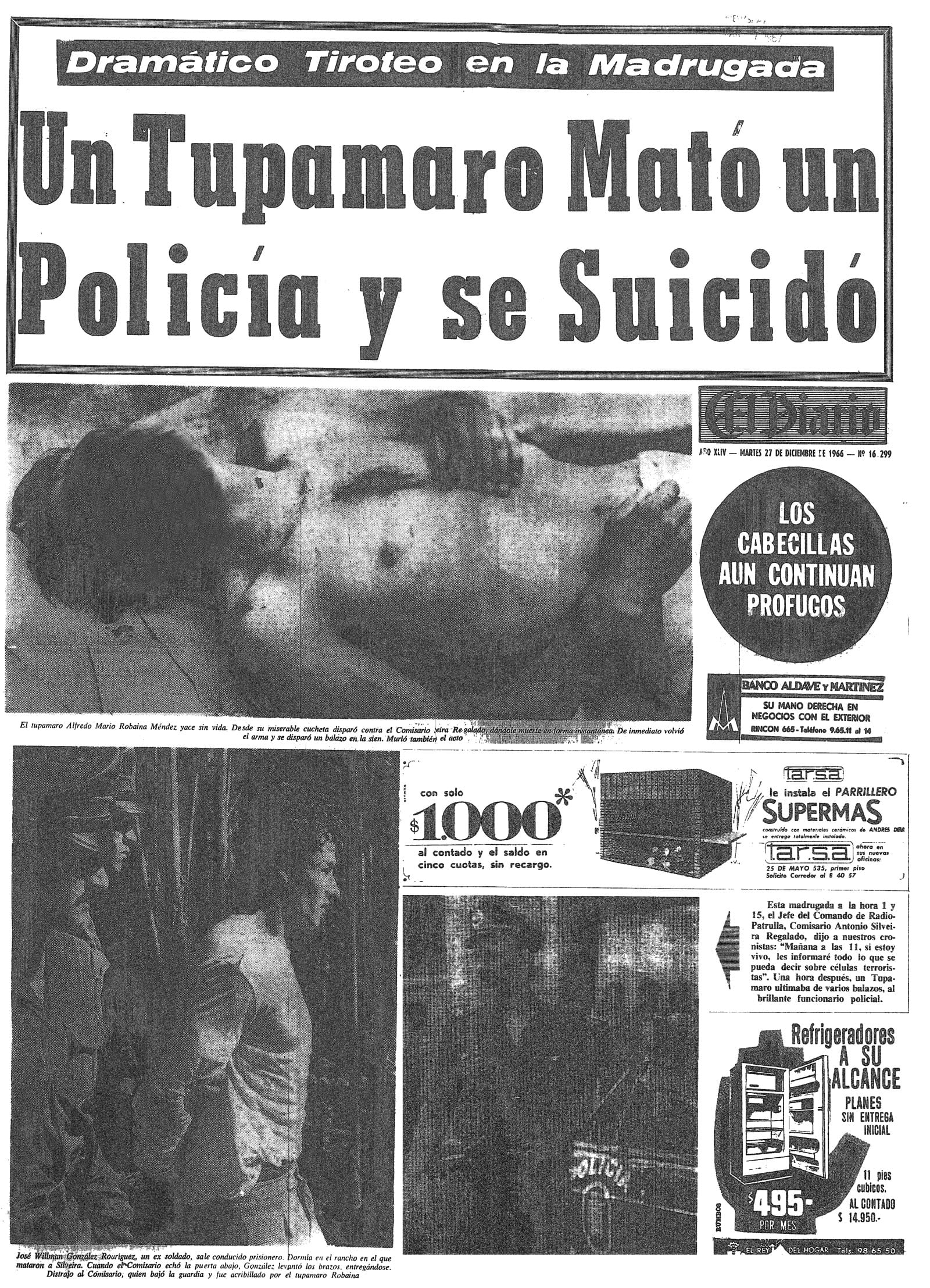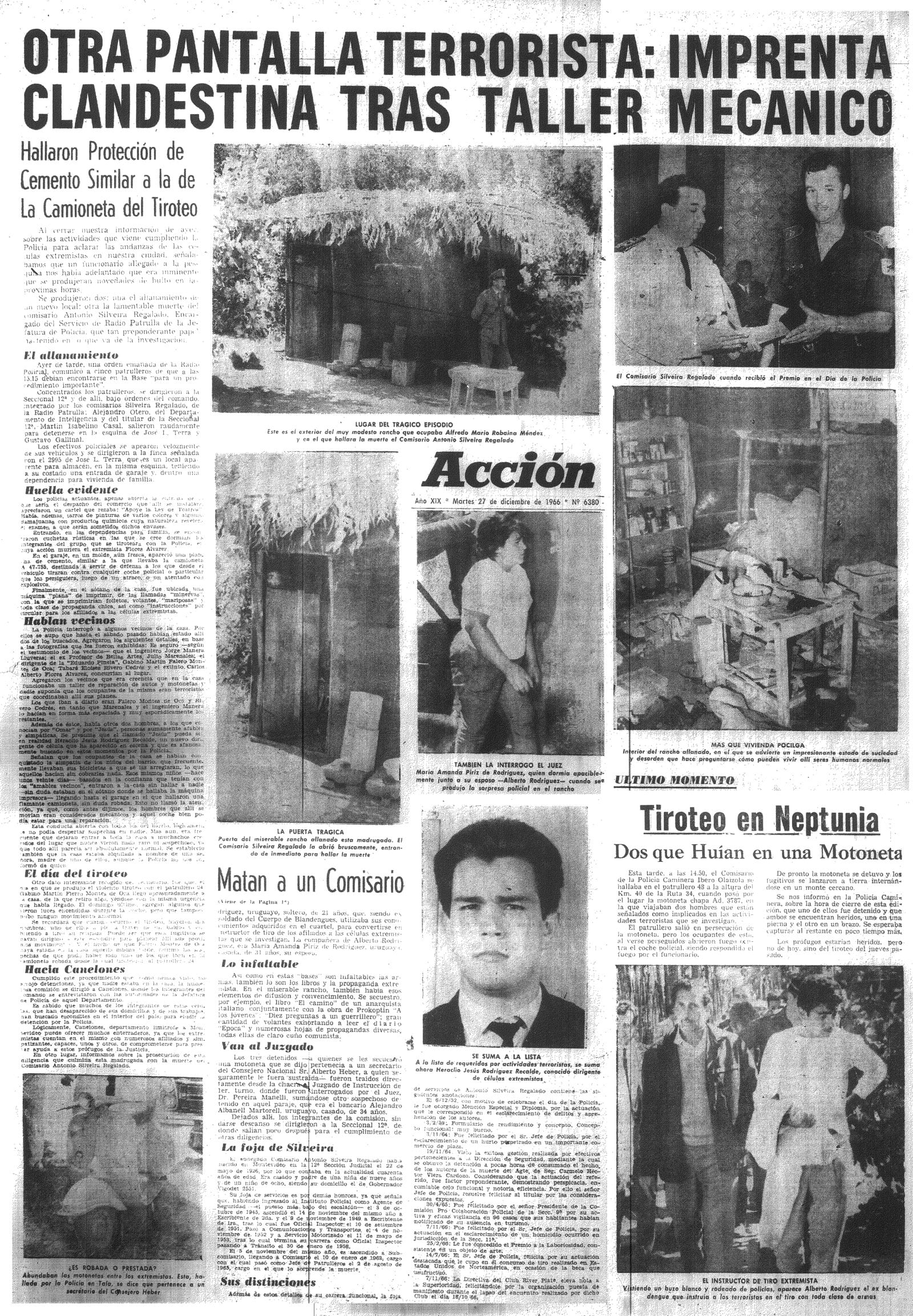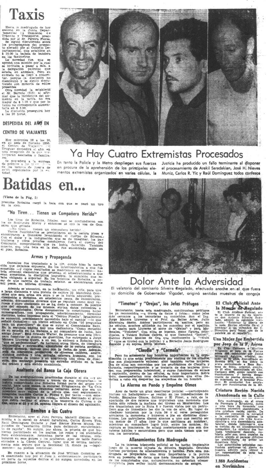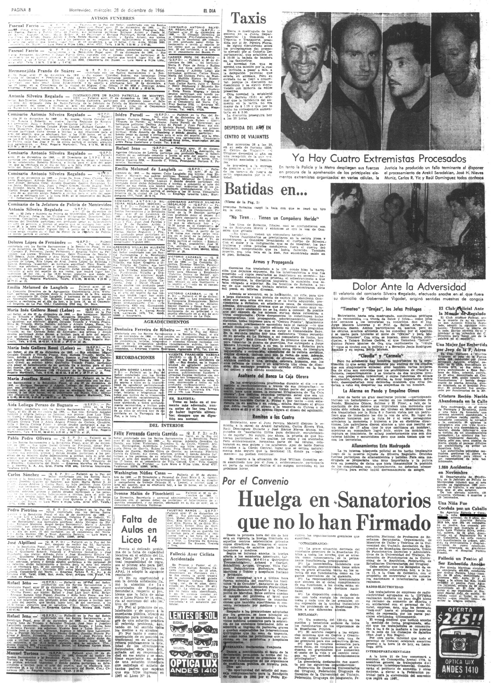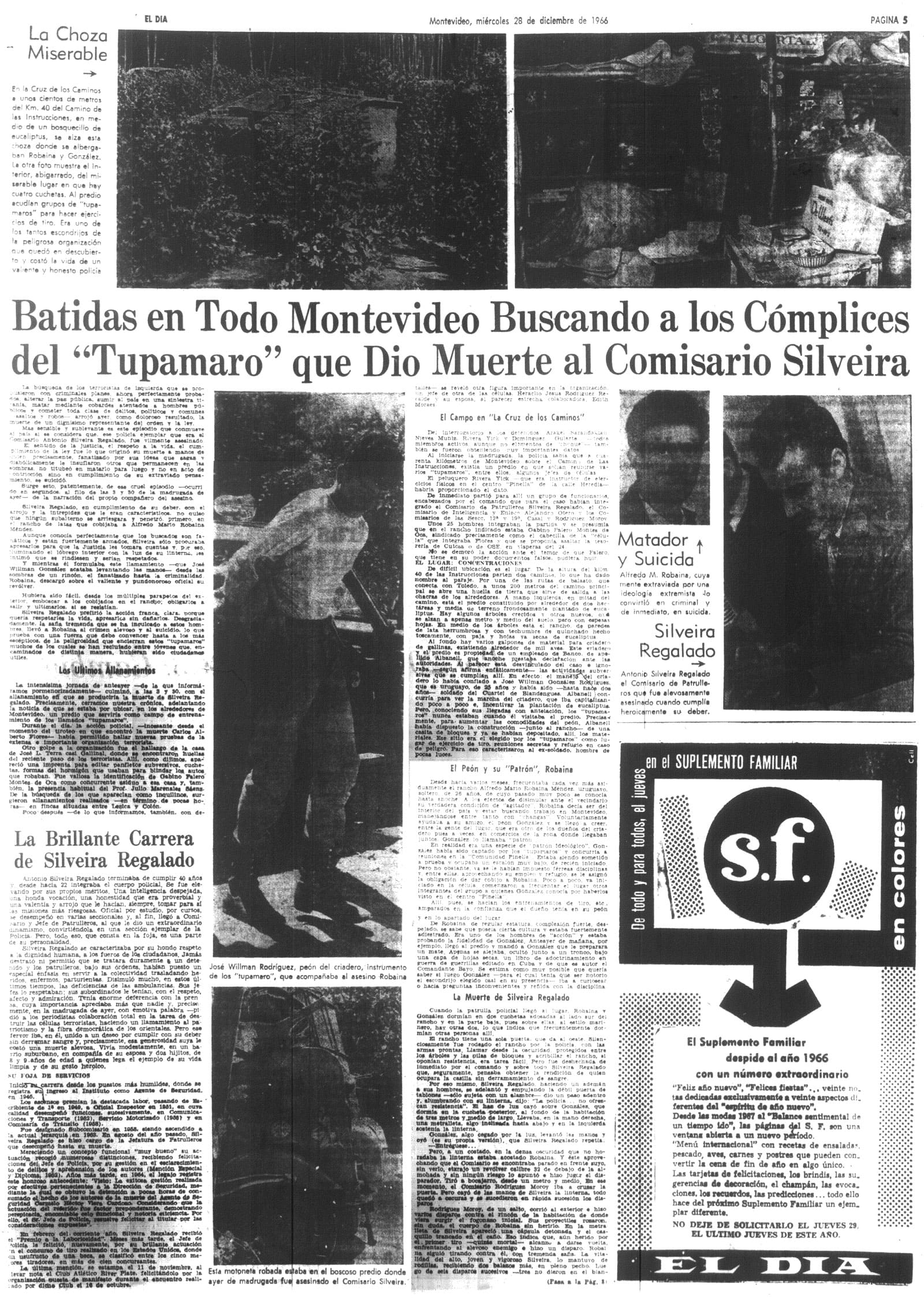 Aparece foto a cuyo pie dice: “El Tupamaro... yace sin vida. Desde su miserable cucheta disparó contra el Comisario Silveira Regalado, dándole muerte en forma instantánea. De inmediato volvió el arma y se disparó un balazo en la sien. Murió también en el acto”. Aparece foto a cuyo pie dice: “..., un ex soldado, sale conducido prisionero. Dormía en el rancho en el que mataron a Silveira. Cuando el comisario echó la puerta abajo... levantó los brazos entregándose. Distrajo al comisario, quien bajó la guardia y fue acribillado por el Tupamaro...”