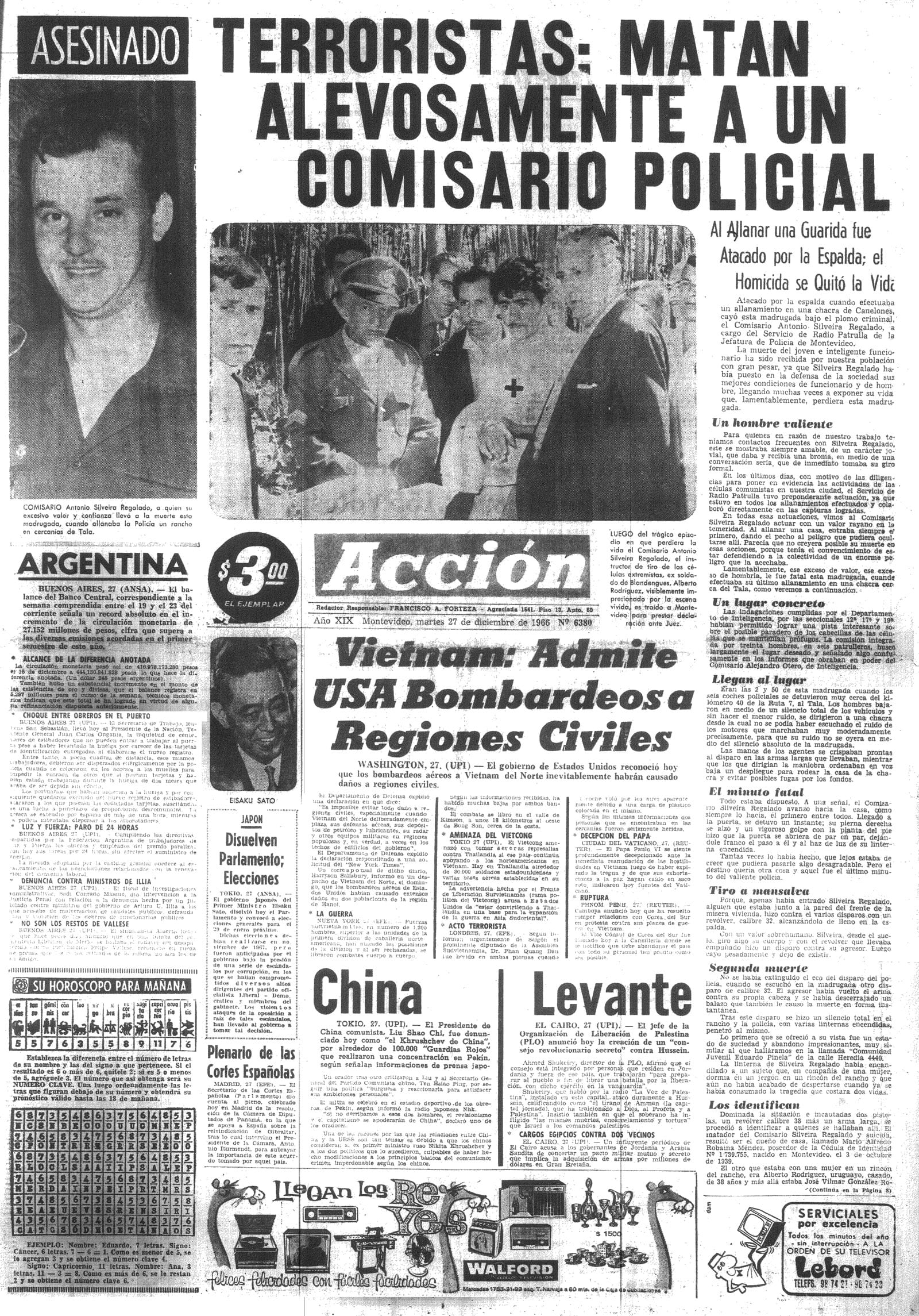 Atacado por la espalda cuando efectuaba un allanamiento en una chacra de Canelones, cayó esta madrugada bajo el plomo criminal, el Comisario Antonio Silveira Regalado, a cargo del Servicio de Radio Patrulla de la Jefatura de Policía de Montevideo. La muerte del joven e inteligente funcionario ha sido recibida por nuestra población con gran pesar, ya que Silveira Regalado había puesto en la defensa de la sociedad sus mejores condiciones de funcionario y de hombre, llegando muchas veces a exponer su vida que, lamentablemente, perdiera esta madrugada. La portada continúa detallando con diferentes subtítulos los sucesos y las características del Comisario.”