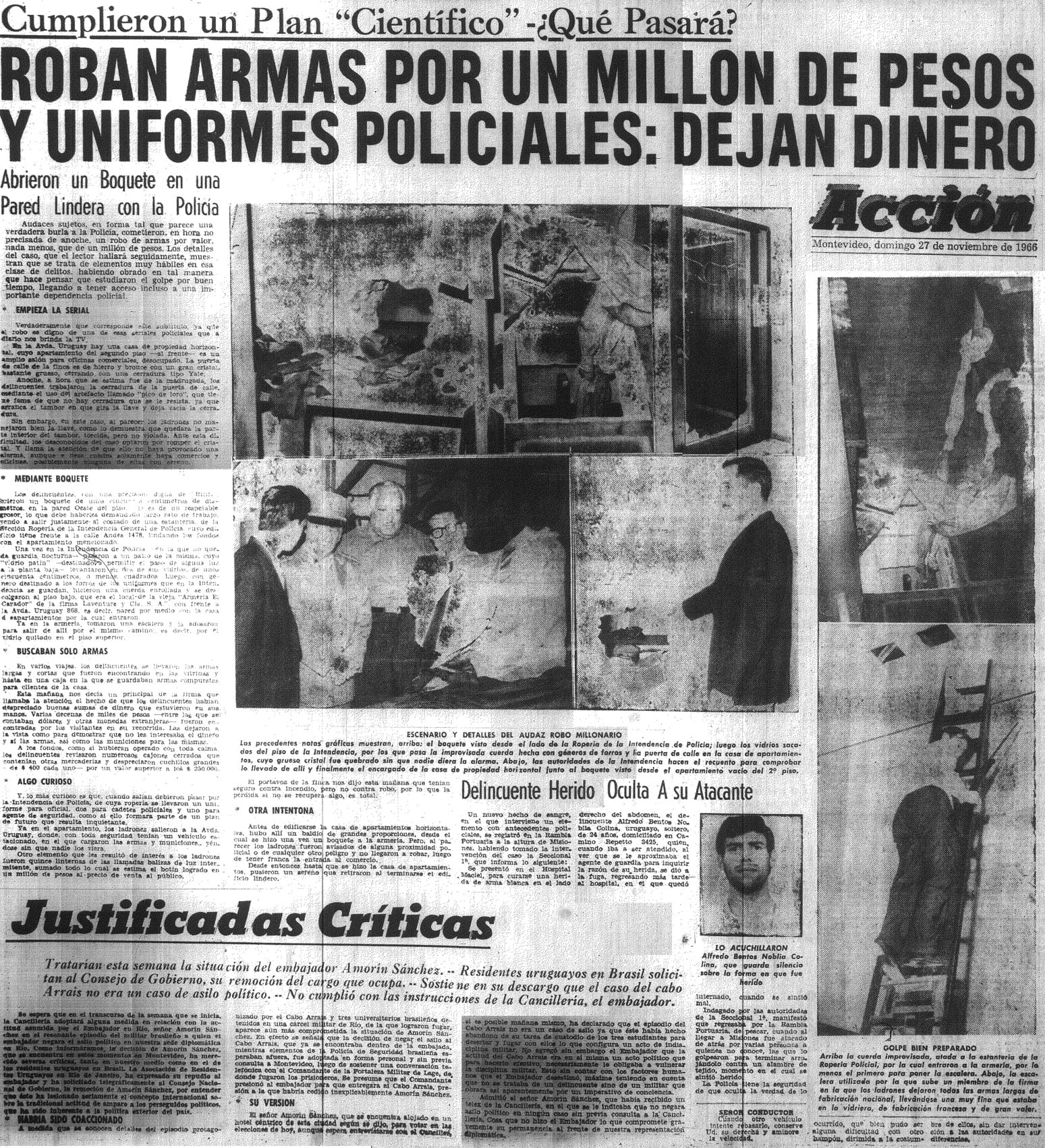 “...Ocho hombres y dos mujeres brindaríamos apoyo desde afuera en diversas misiones. Encabezados por Marenales, entrarían cinco... Un local para alquilar en el edificio de apartamentos contiguo nos ofrecía, providencialmente, el camino de entrada con sólo hacer un boquete... Aprovechando un momento en que la puerta quedó abierta, a eso de la hora 19, los cinco compañeros entraron al edificio... Amanecía el 27 de noviembre de 1966: 63 armas de diverso calibre, más de 10.000 proyectiles, herramientas, uniformes policiales, etc., iban en una camioneta custodiada por otra, hacia el taller de José L. Terra...”.