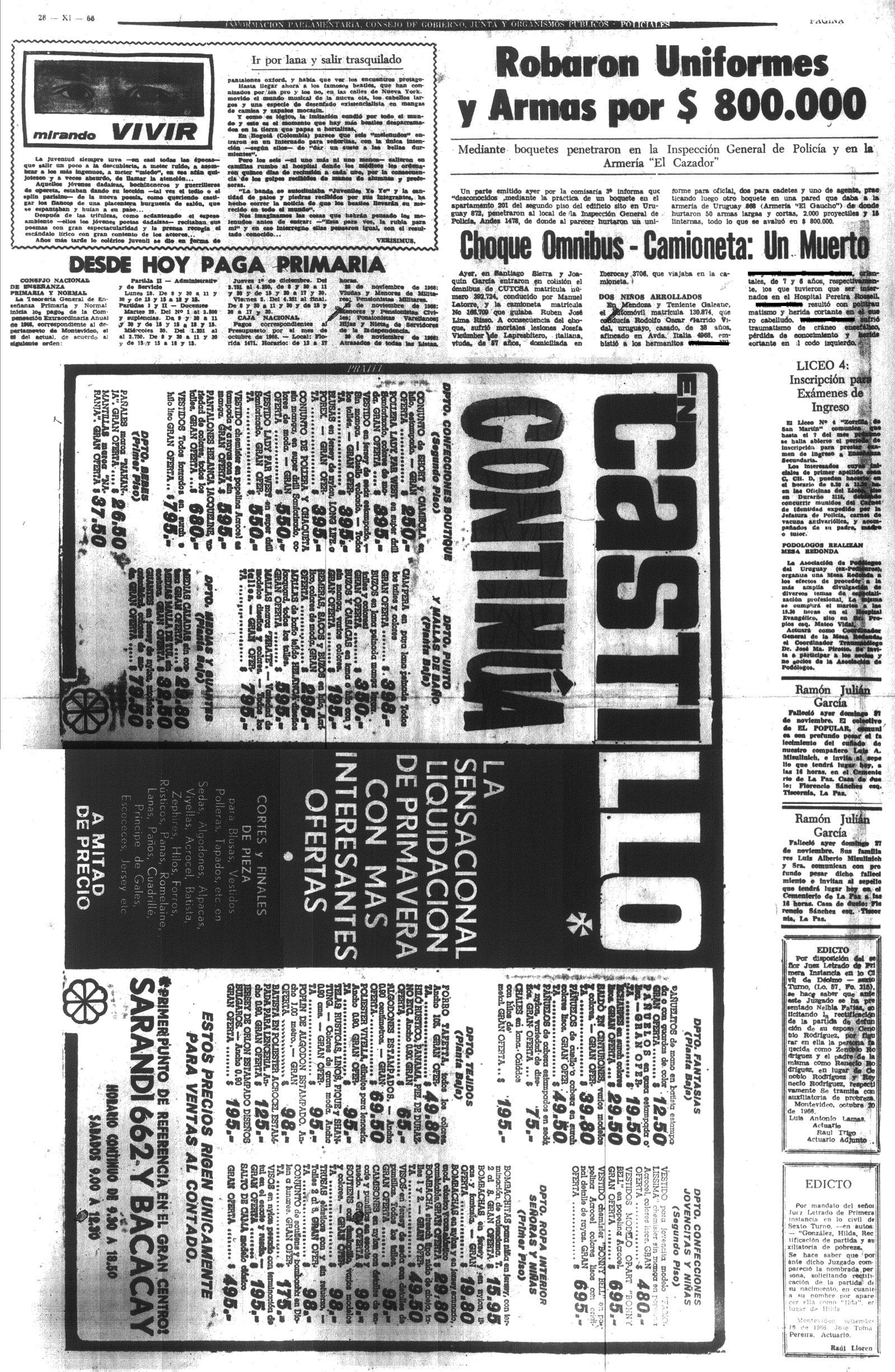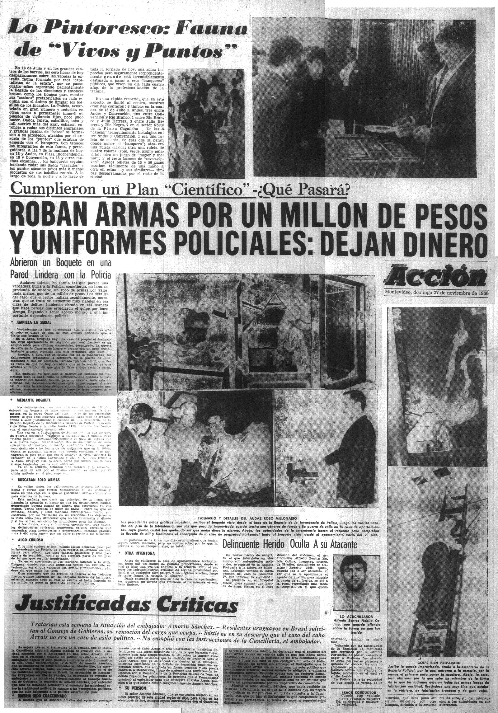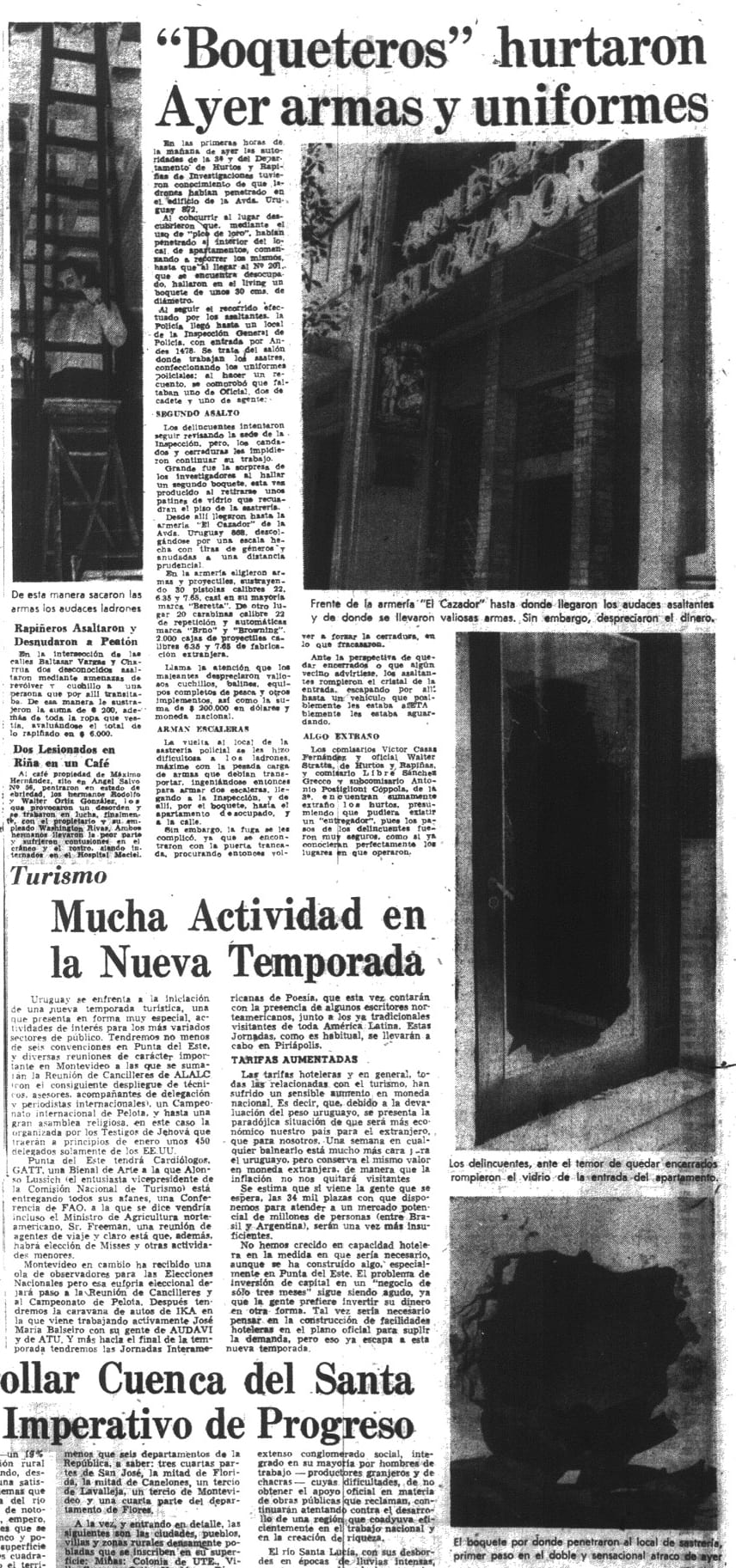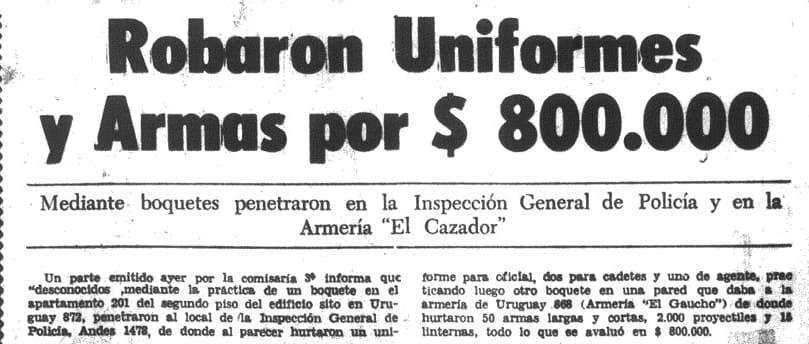 “La noche de la elección nacional, el 27 de noviembre, aprovechando la distracción de las fuerzas de seguridad a cargo de la custodia del acto cívico, los tupamaros lograron desvalijar la Armería El Cazador, en pleno centro de Montevideo: diez bultos que contenían unas veinte armas largas –rifles y escopetas– , casi cincuenta revólveres, cerca de diez mil municiones y más de quince uniformes policiales se escurrieron en la madrugada del domingo”.